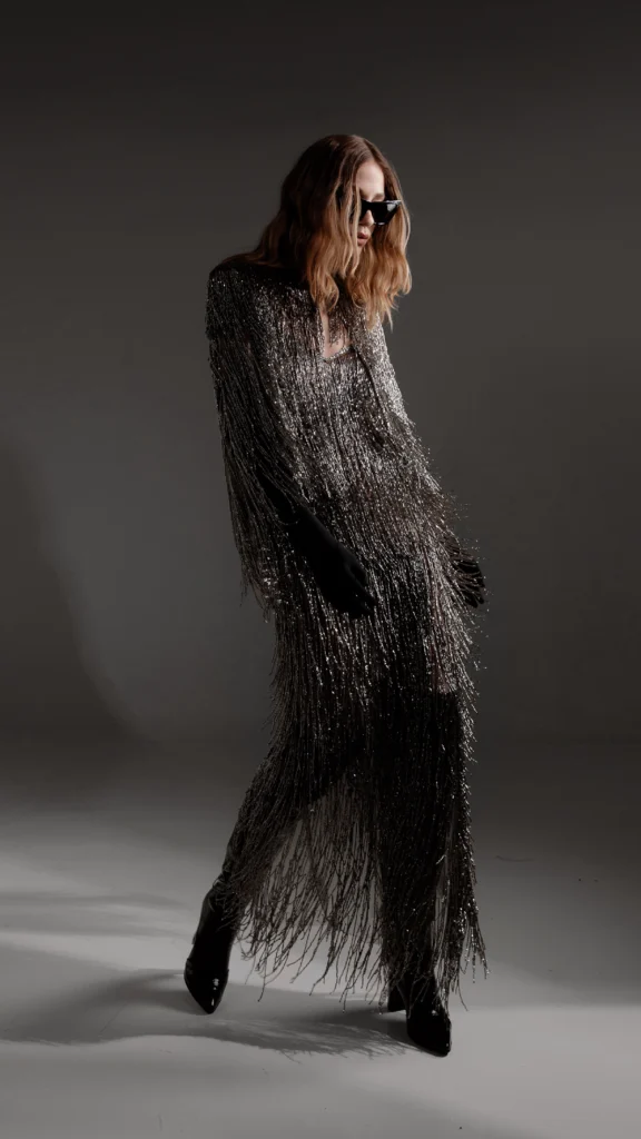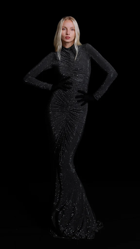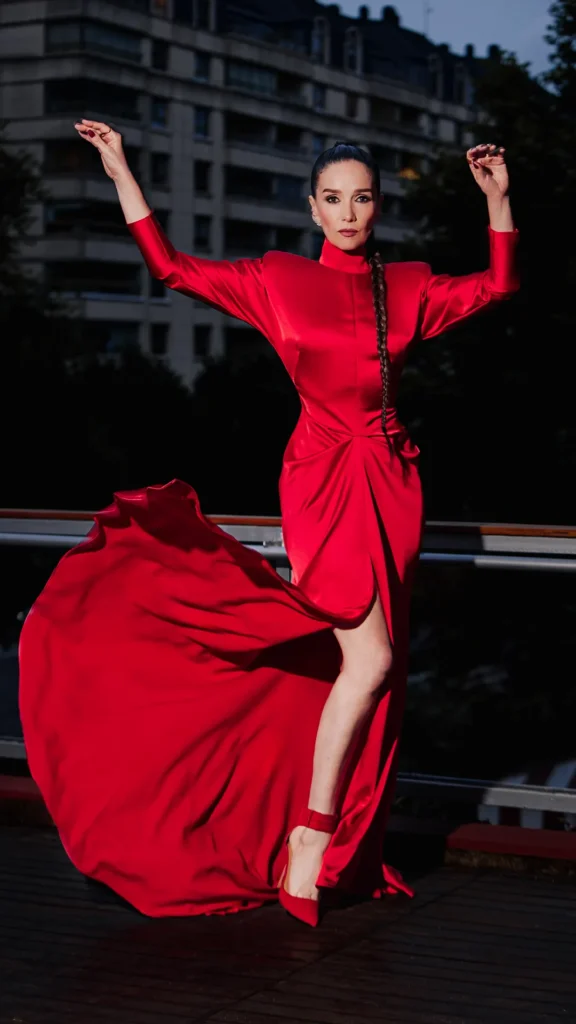 Confeccionado en crepé de seda rojo profundo, de brillo casi líquido, la creación de GOROF reinterpreta la elegancia de las divas de Hollywood de los años 30, traducida a un lenguaje contemporáneo y poderoso.