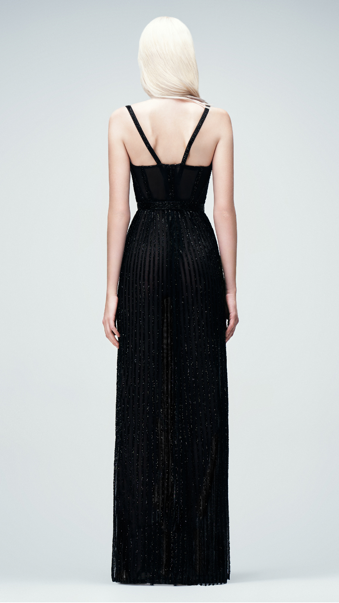 Vestido largo en tono noir, confeccionado en tul francés bordado con delicados cristales checoslovacos. Destaca por su construcción en corsetería, corte strapless y escote en V. Posee una falda lápiz con caída evasé y un tajo lateral. Se complementa con un cinturón de malla metálica.