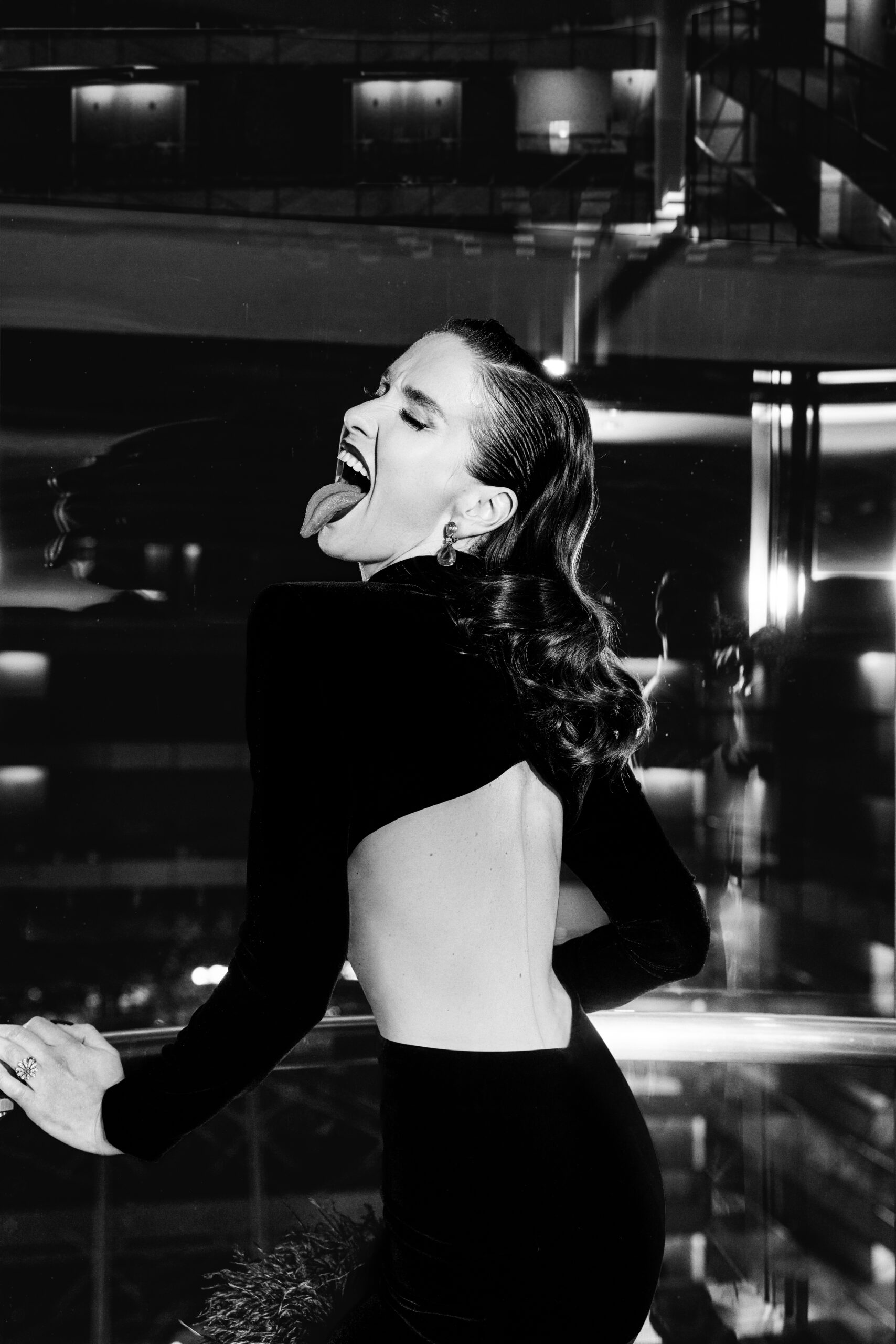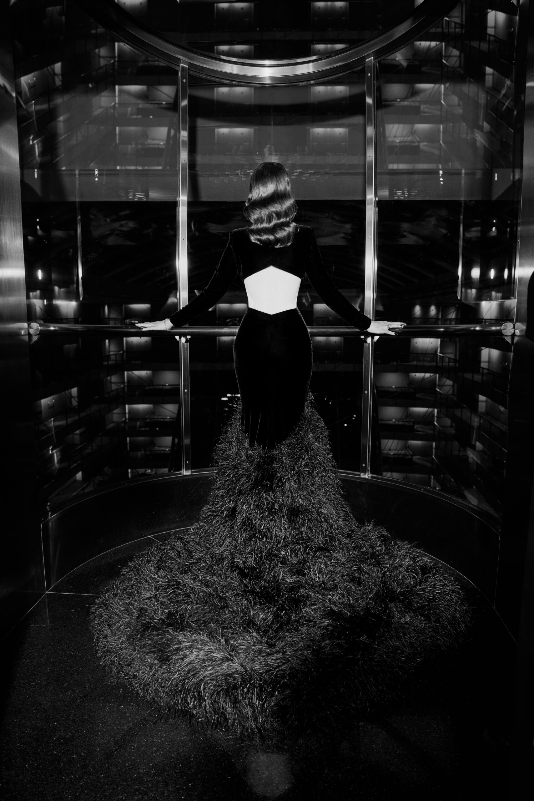 Vestido de dos piezas en tono noir, confeccionado en terciopelo de seda. La parte superior consiste en un cropped top con terminación geométrica en el bajo busto y un escote diamante en la espalda. La prenda se completa con una falda de estilo sirena, que presenta una cola y está adornada con plumas bordadas artesanalmente en bajo ruedo.