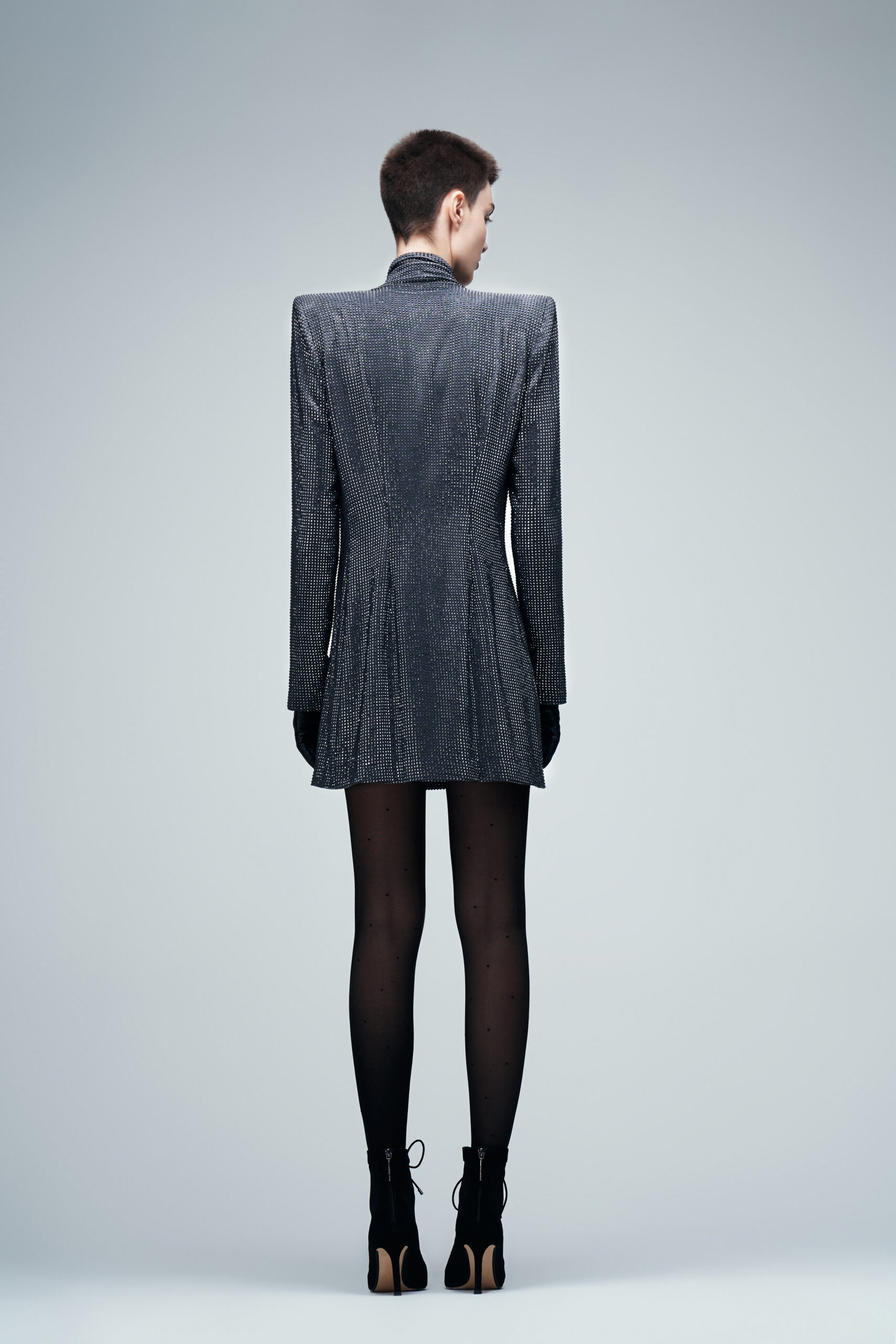 Vestido sastre en tono noir & silver, confeccionado en tul francés con cristales a tono. Presenta hombros destacados y un escote solapa de líneas net. Se complementa con pantys polka polka.