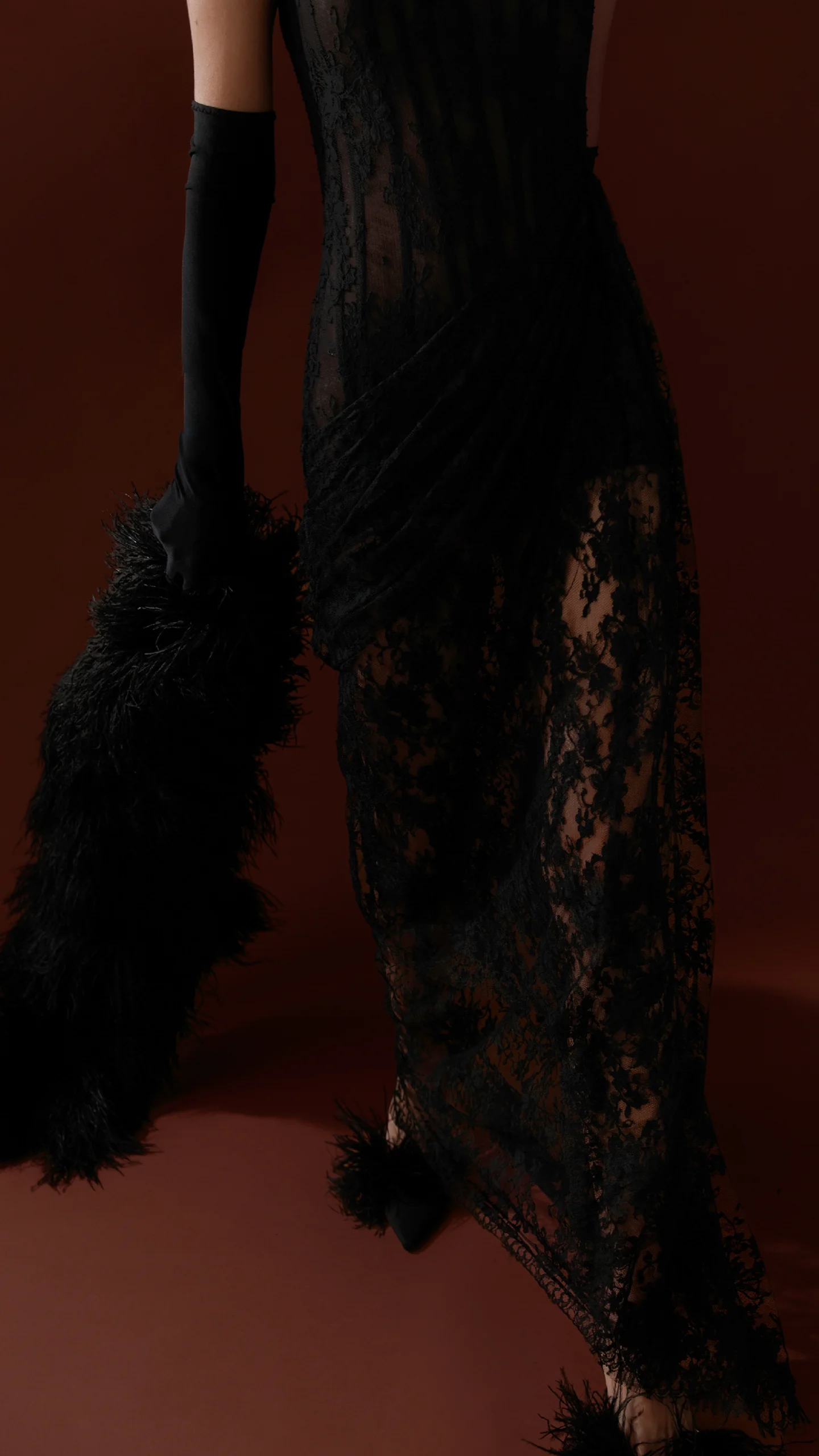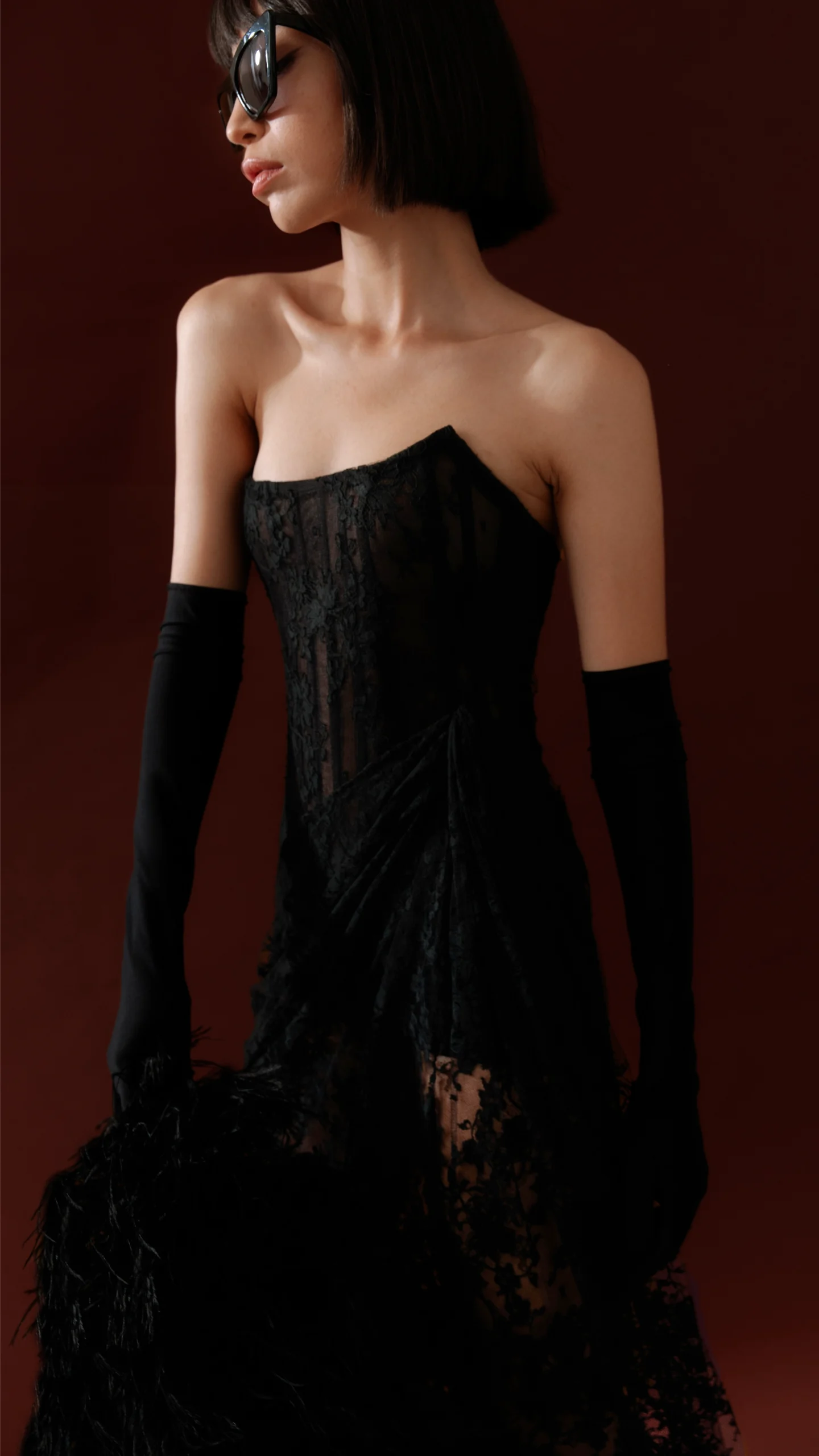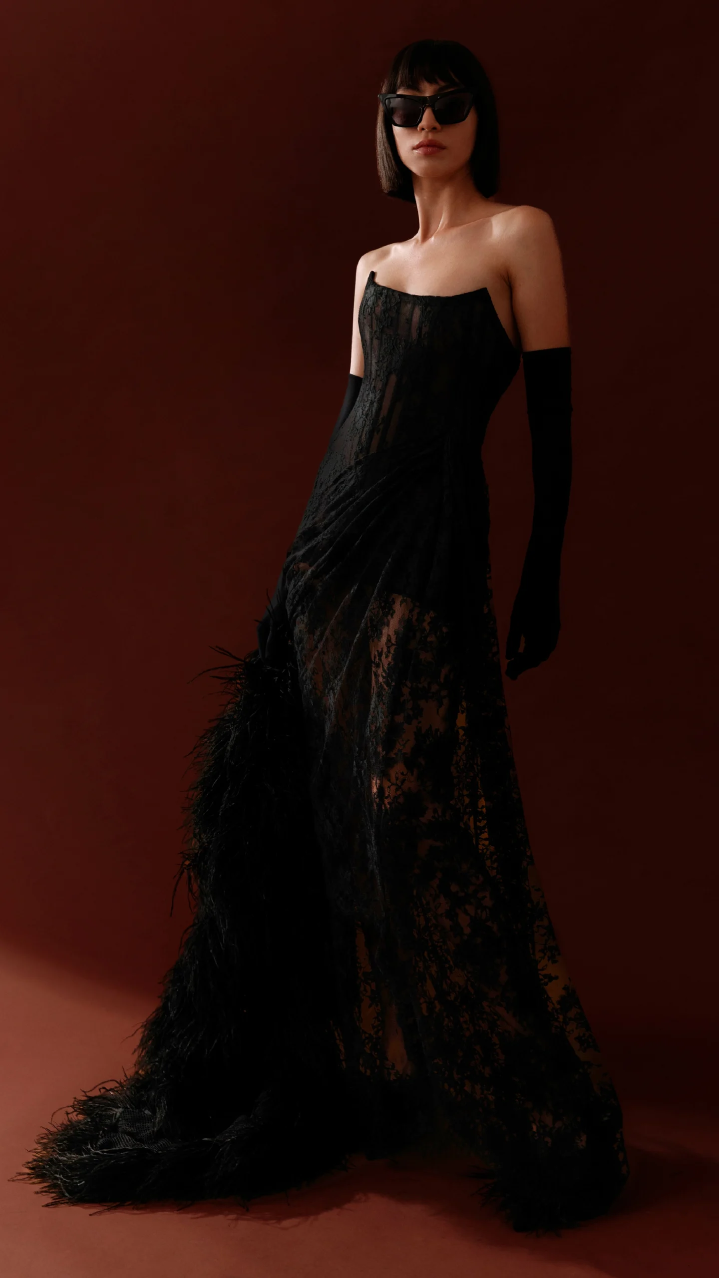 Vestido largo en tono Noir, confeccionado en encaje Chantilly francés. Construcción corsetera de escote strapless y falda drapeada al bies con abertura lateral y destacada quilla.