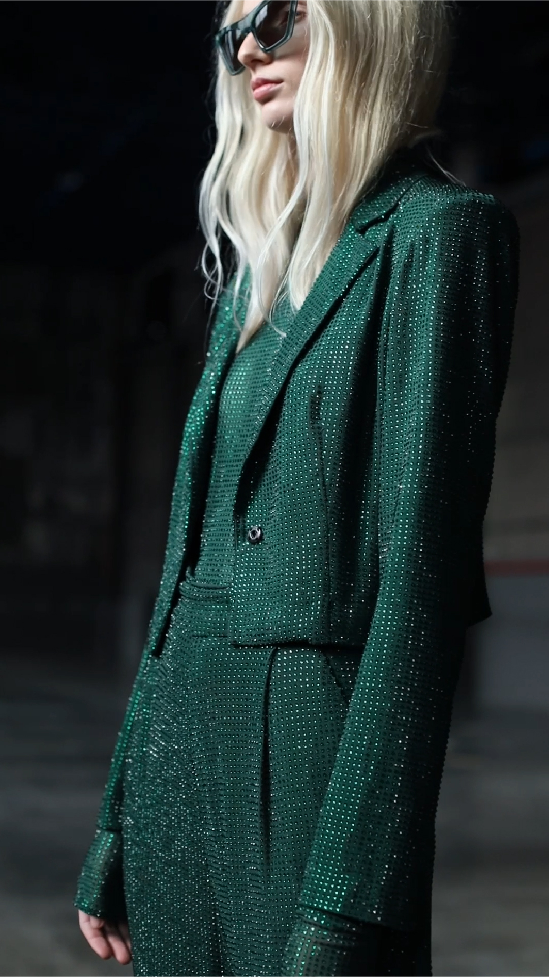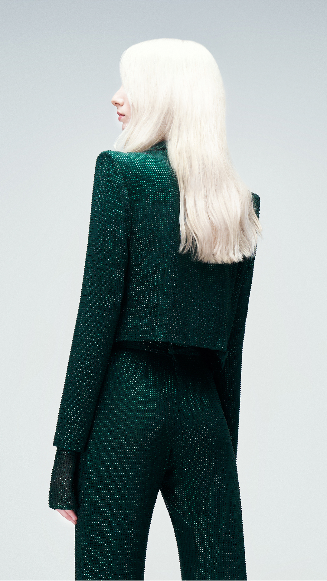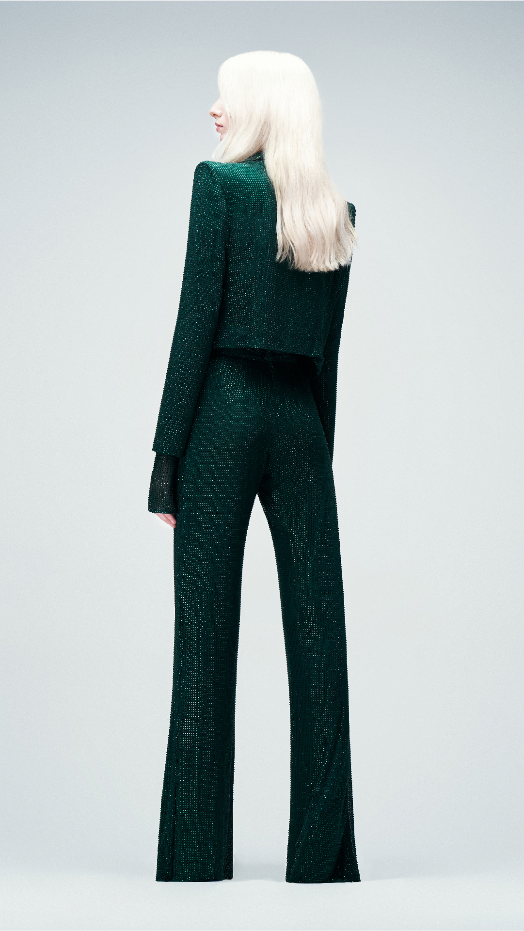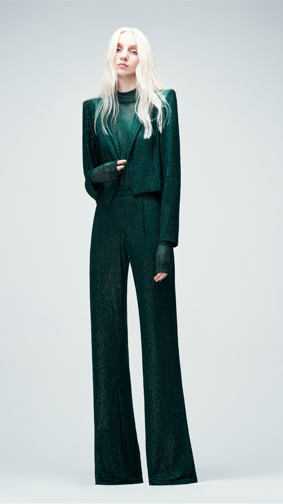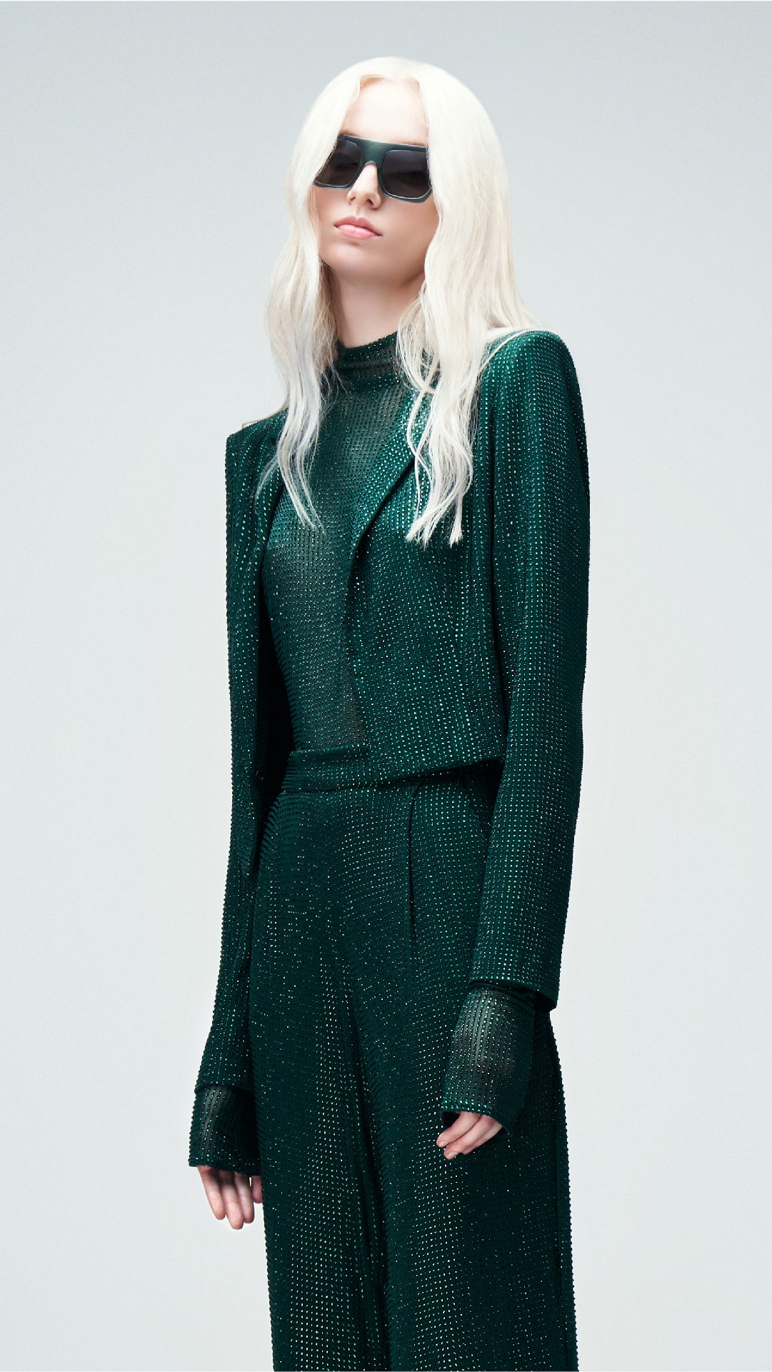 Diseño sastre de tres piezas en tono green, confeccionado en tul francés con cristales a tono. Se compone por un cropped jacket cruzado con hombros destacados, con escote solapa asimétrico. Se complementa con un body construido con cuello mao y manga larga, además de un pantalón de tiro alto con corte oxford.