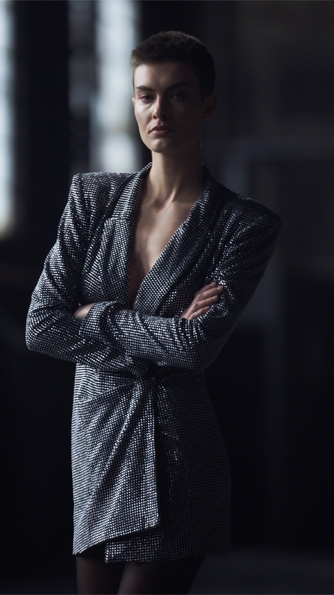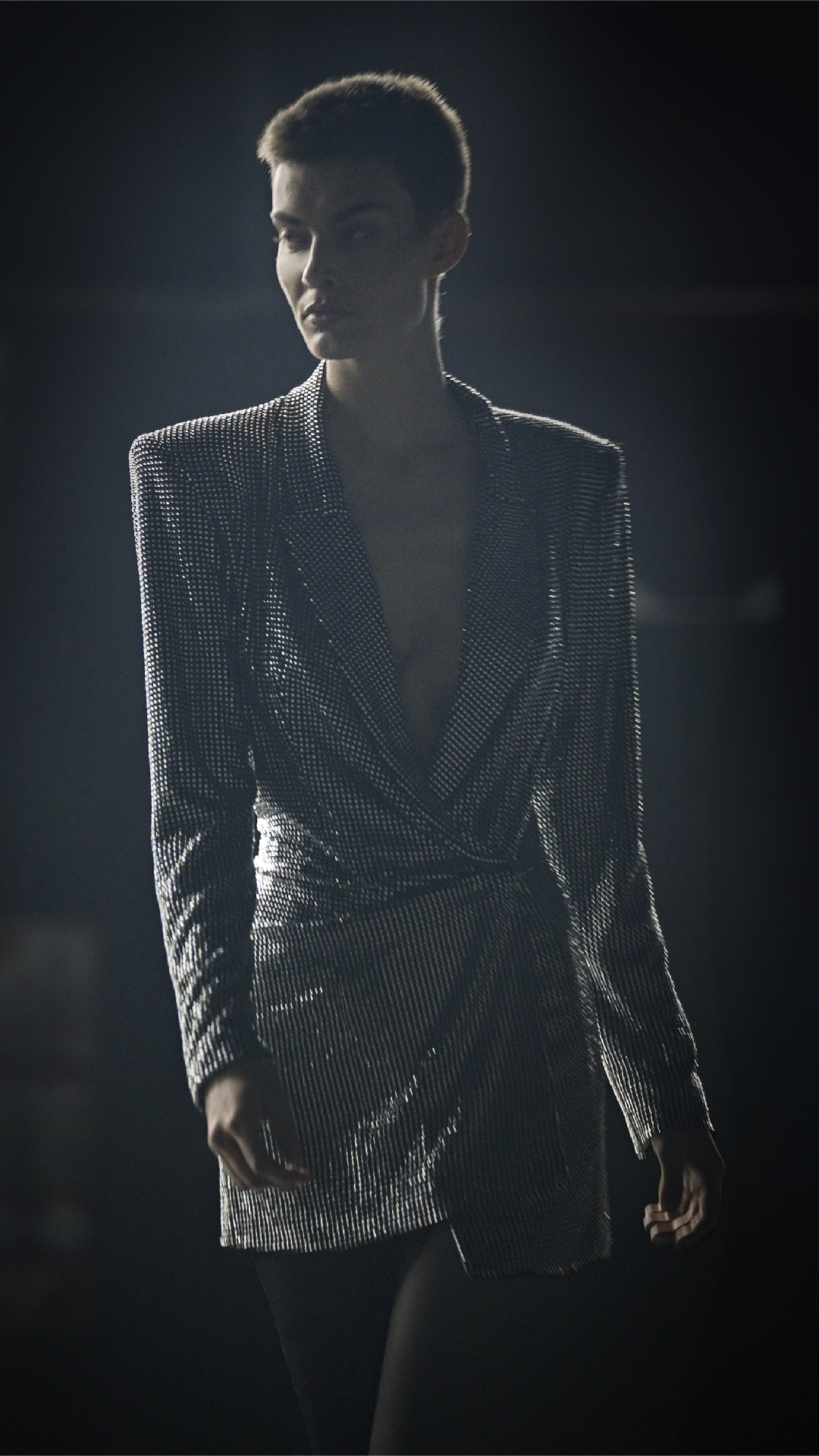 Vestido sastre en tono noir & silver, confeccionado en tul francés con cristales a tono. Destaca con hombros pronunciados, escote solapa de líneas net y un sutil drapeado en la cintura que realza la figura. Se complementa con pantys polka polka.