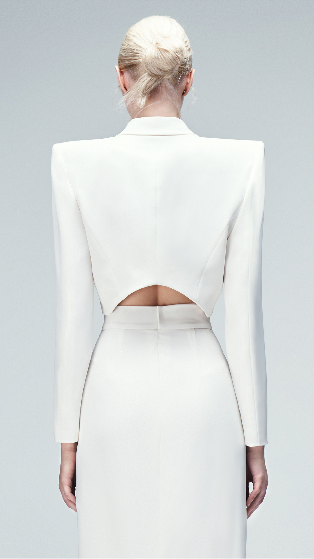Diseño sastre de tres piezas en tono off white, confeccionado en crepe italiano. Se compone por un top de escote en V con delicados breteles y espalda cavada. Se complementa con una falda de largo midi drapeada que resalta la silueta. Además, presenta un cropped jacket de hombros destacados y escote solapa de bajo irregular para añadir un toque adicional de estilo.