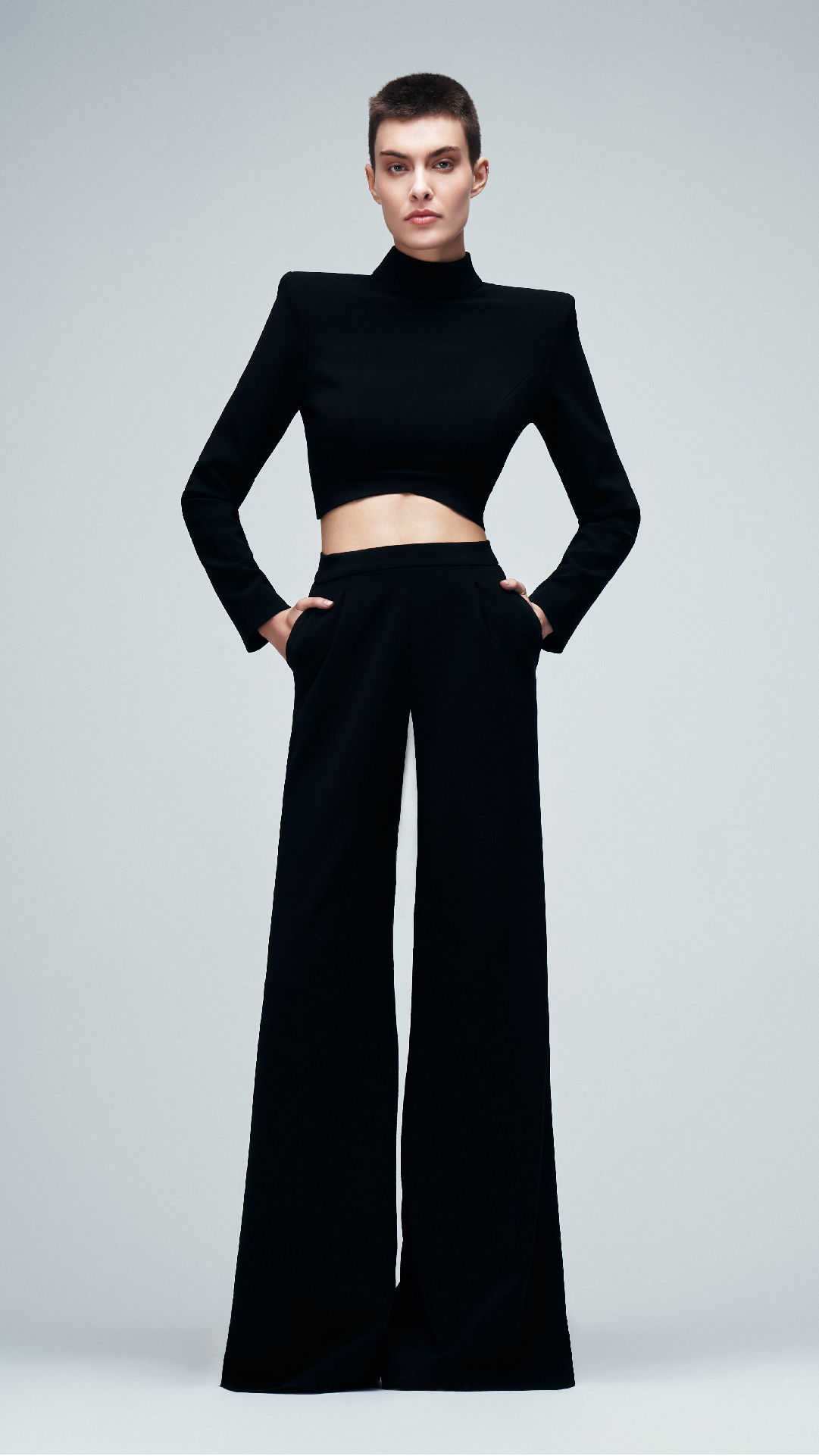 Diseño sastre de dos piezas en tono noir, confeccionado en crepe italiano. Se compone por un cropped con cut out en la espalda, de cuello mao y mangas largas. Se complementa con un pantalón de tiro alto en corte oxford.