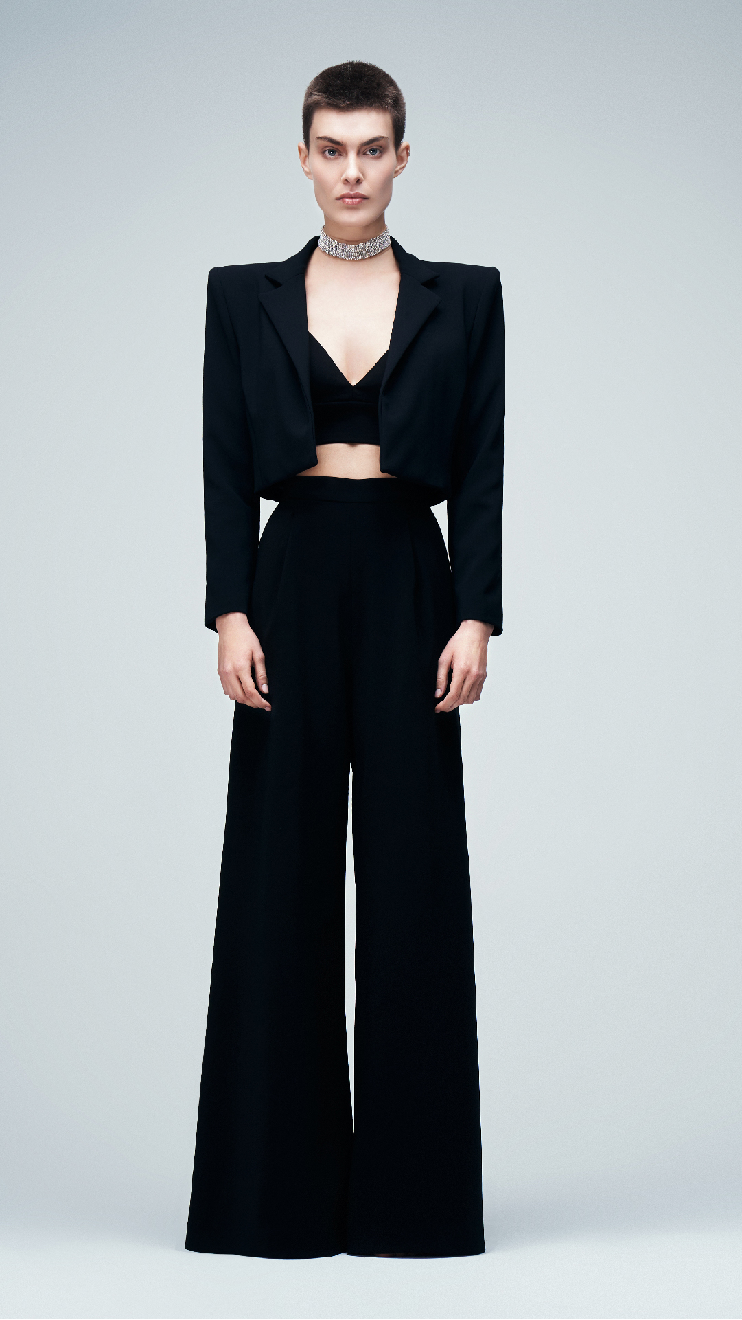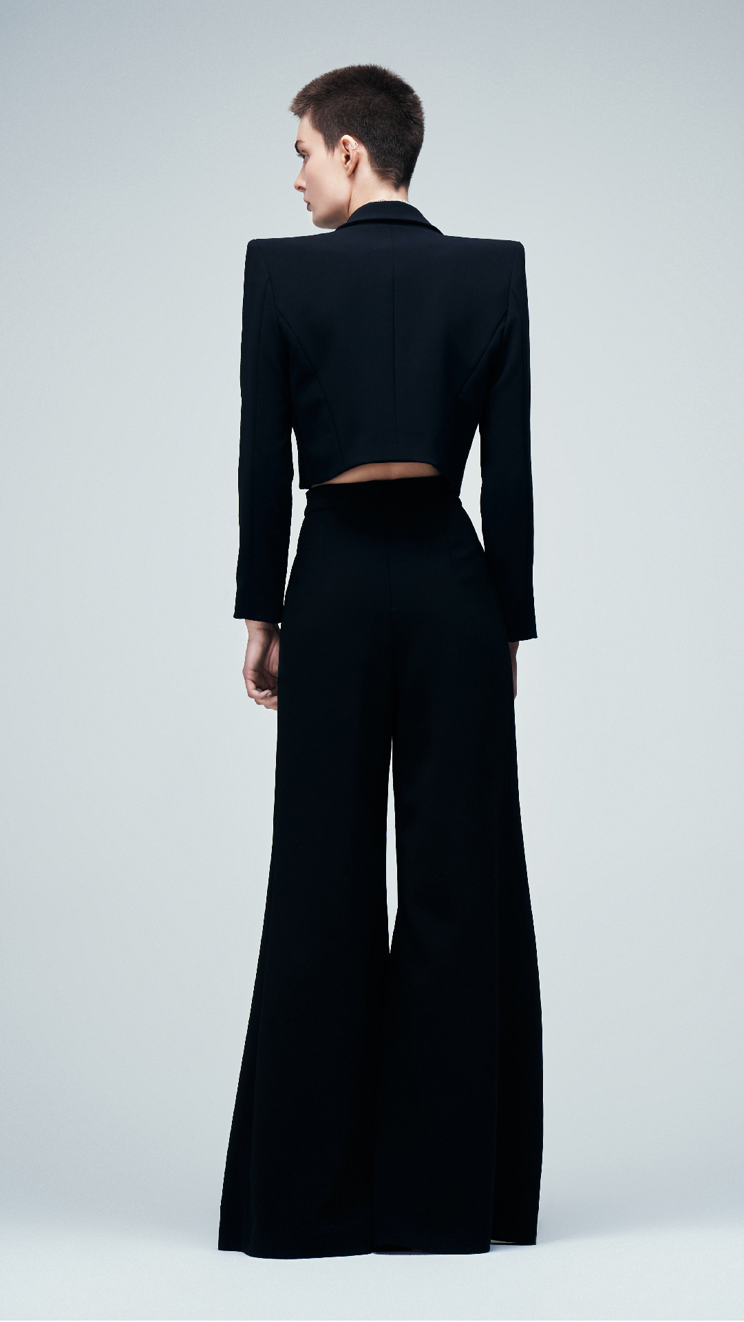 Diseño sastre de tres piezas en noir, confeccionado en crepe italiano. Se compone por un top de escote en V con delicados breteles y espalda cavada. Se complementa con un pantalón de tiro alto en corte oxford. Además, presenta con un cropped jacket de hombros destacados y escote solapa de bajo irregular.