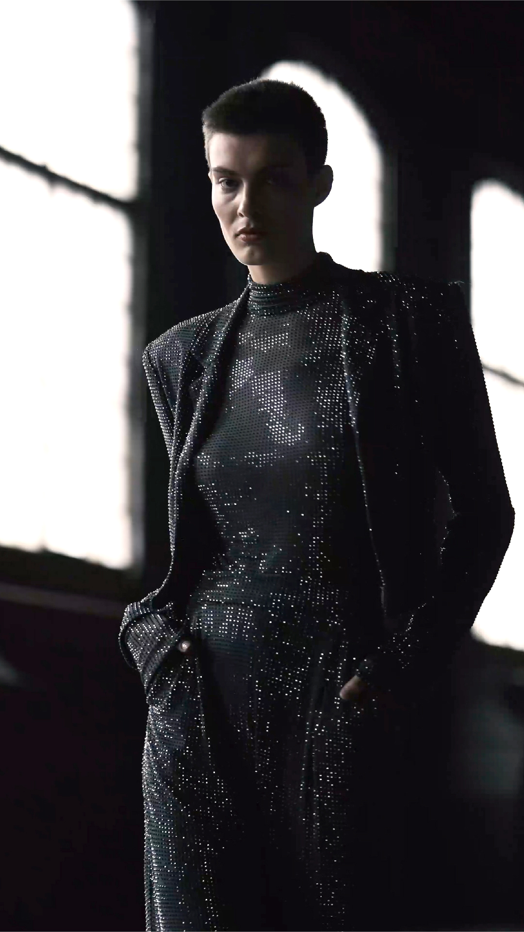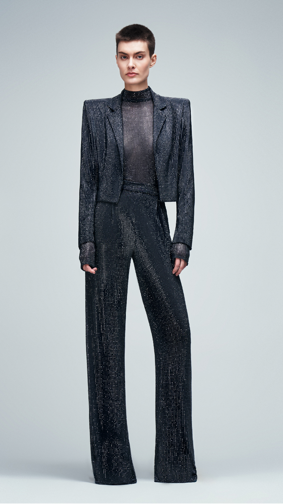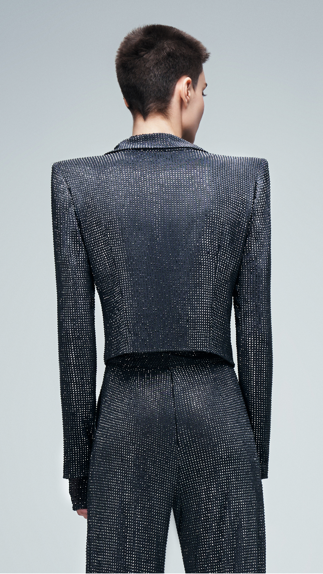 Diseño sastre de tres piezas en tono noir & silver, confeccionado en tul francés con cristales a tono. Se compone por un body construido con cuello mao y manga larga, un pantalón de tiro alto en corte oxford, y se complementa con un cropped jacket de hombros destacados y escote solapa de bajo irregular para un toque adicional de estilo.