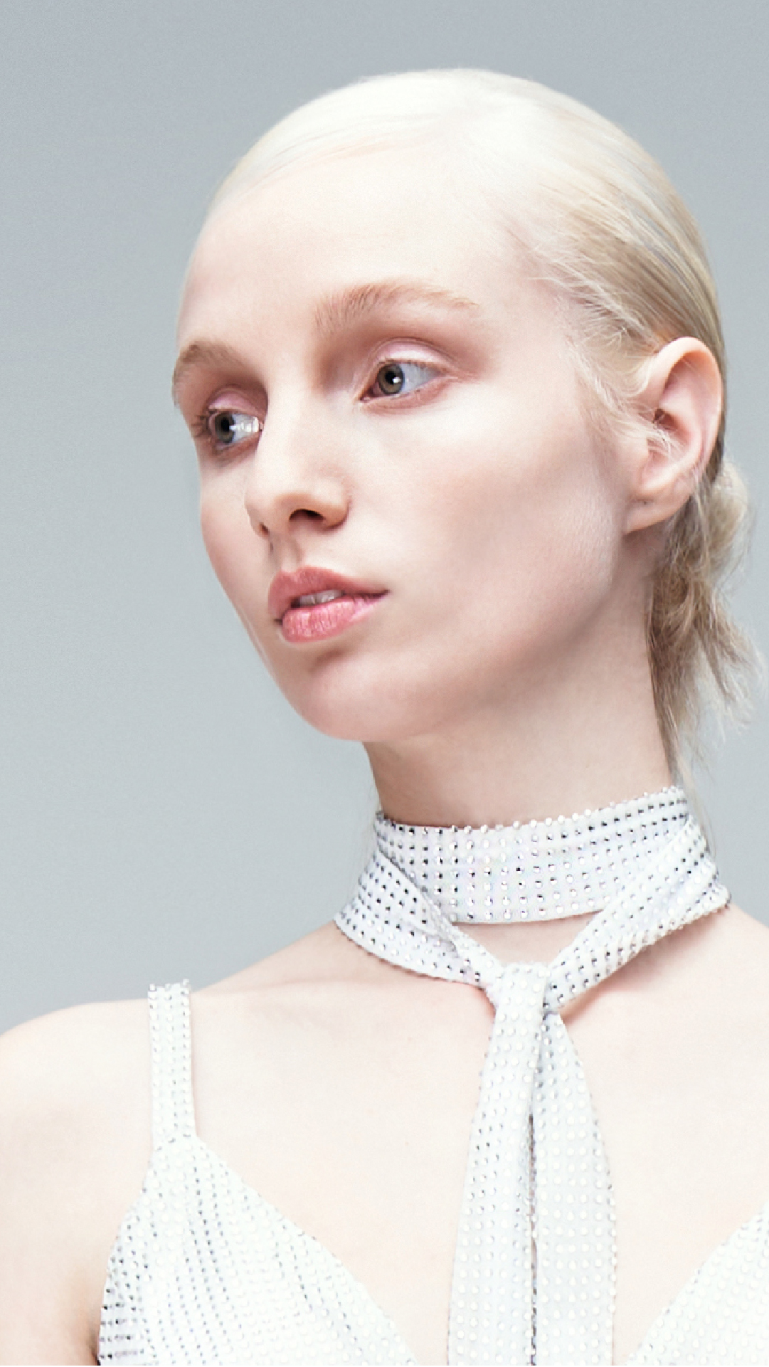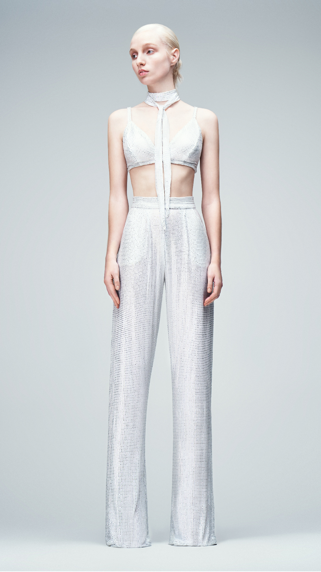 Diseño sastre de dos piezas en tono off white, confeccionado en tul francés con cristales a tono. Se compone por un top de escote en V con delicados breteles y espalda cavada. Se complementa con un pantalón de tiro alto en corte oxford.