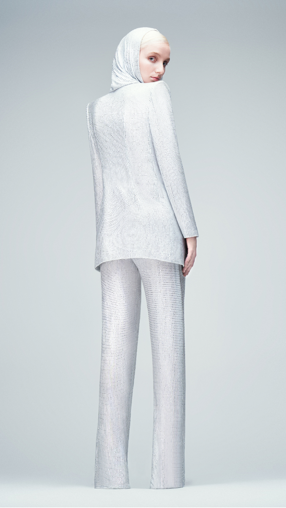 Diseño sastre de dos piezas en tono off white, confeccionado en tul francés con cristales a tono. Compuesto por un blazer de hombros destacados, solapa con una sutil terminación hood, y se complementa con un pantalón tiro alto en corte oxford.