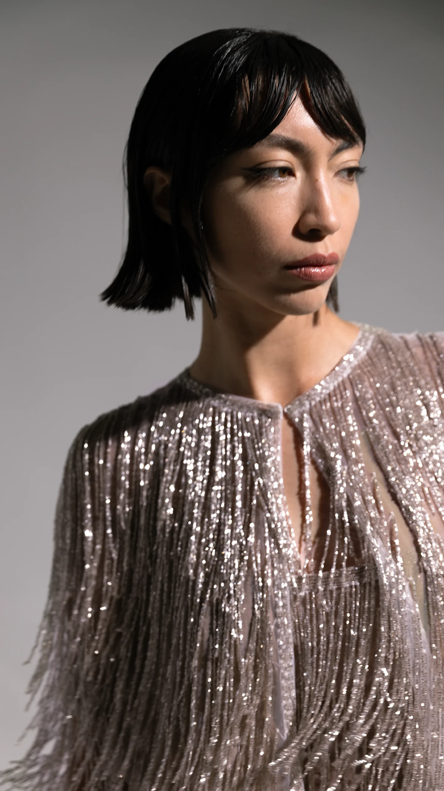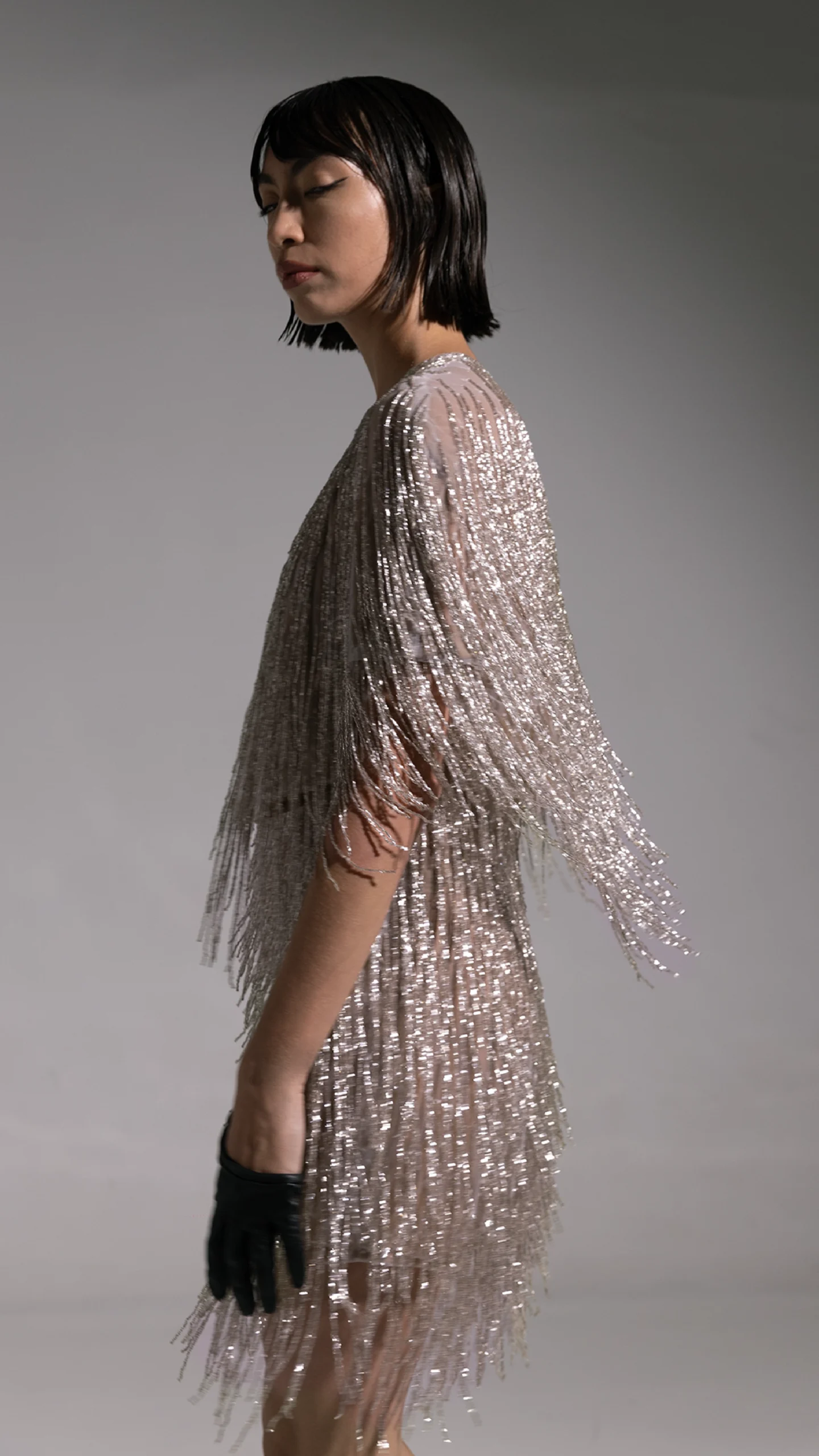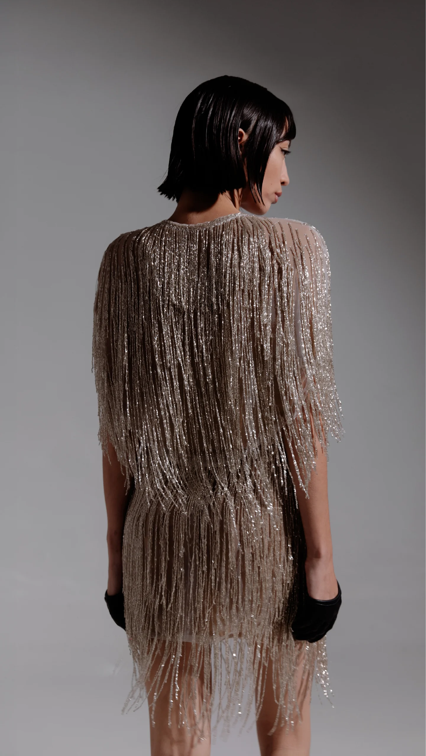 Cropped jacket en tono silver, realizado íntegramente en tul francés bordado y encastrado artesanalmente en flecos de cristales checoslovacos.