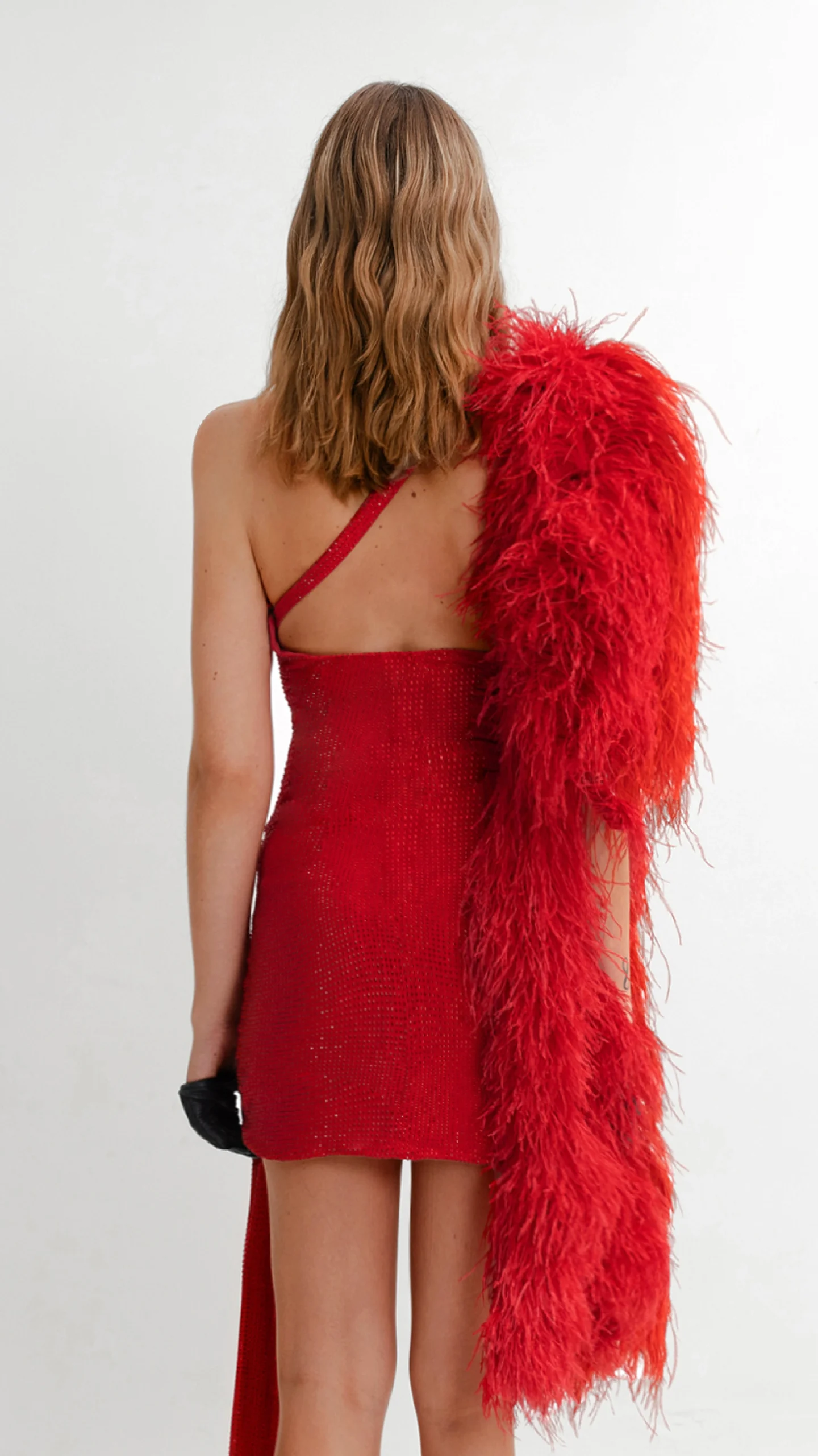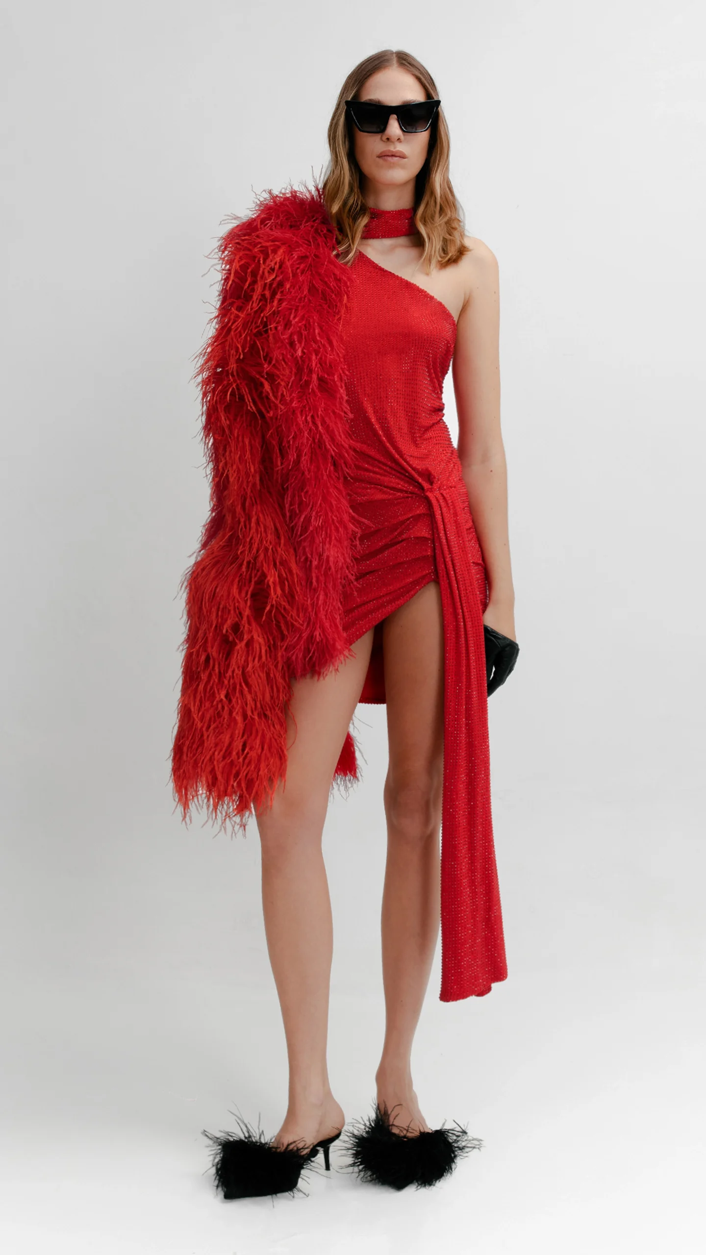 Diseño de dos piezas en tono rouge, confeccionado en tul francés con cristales a tono. Se compone por un top de un hombro, con cuello alto y destacado lazo. Se complementa con una minifalda en moderno drapeado.