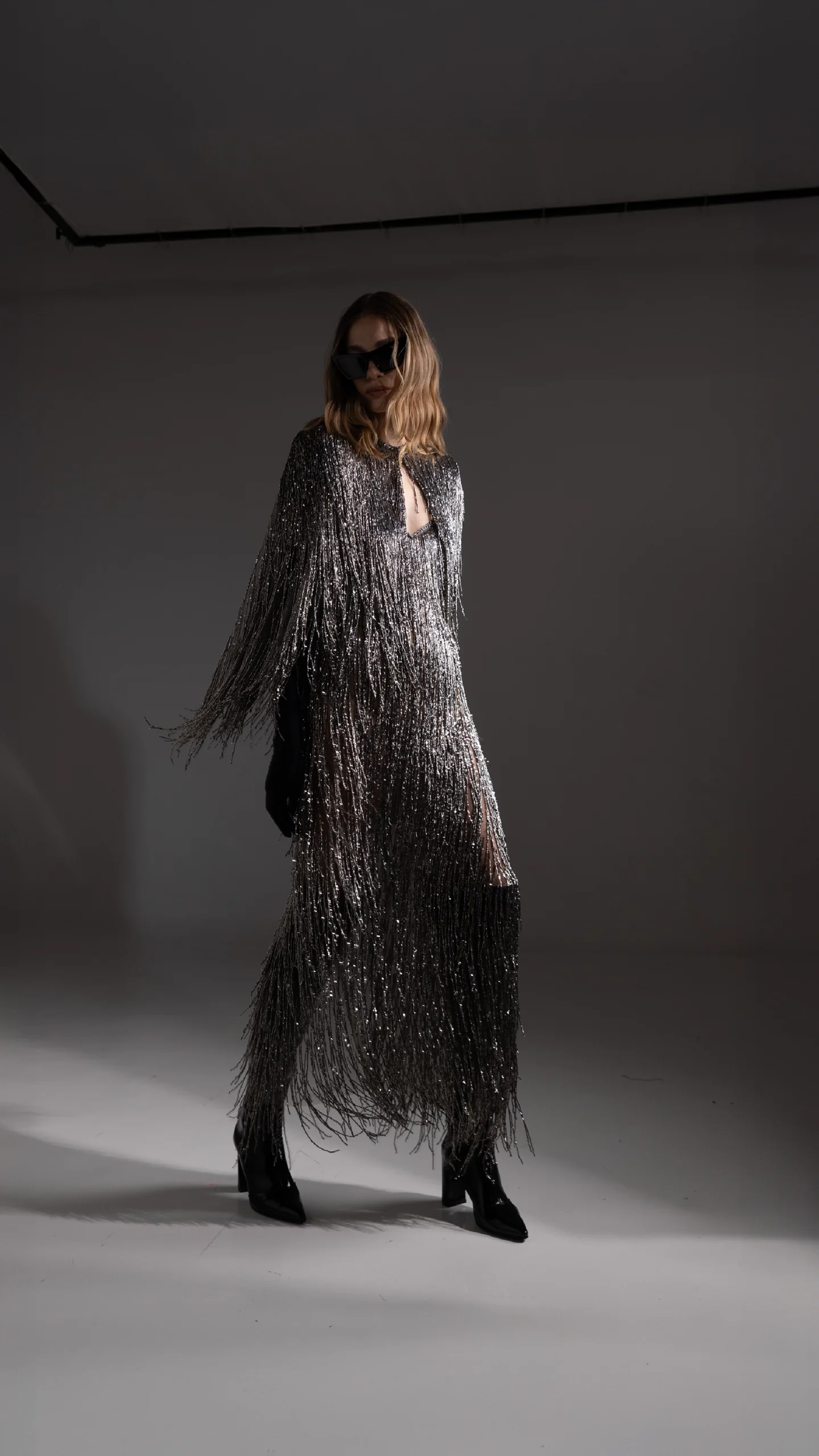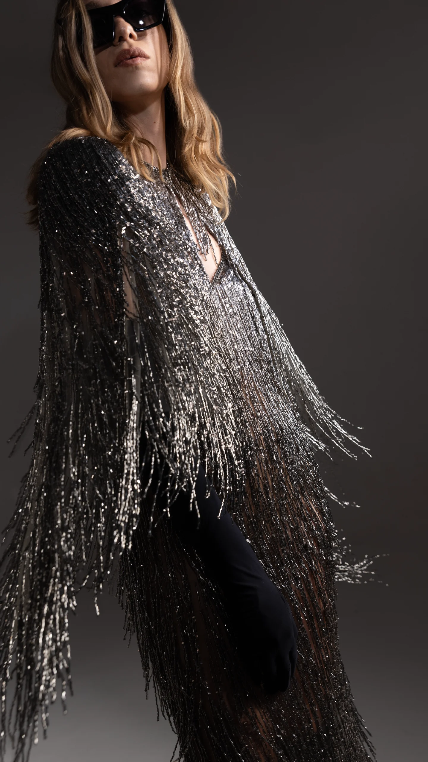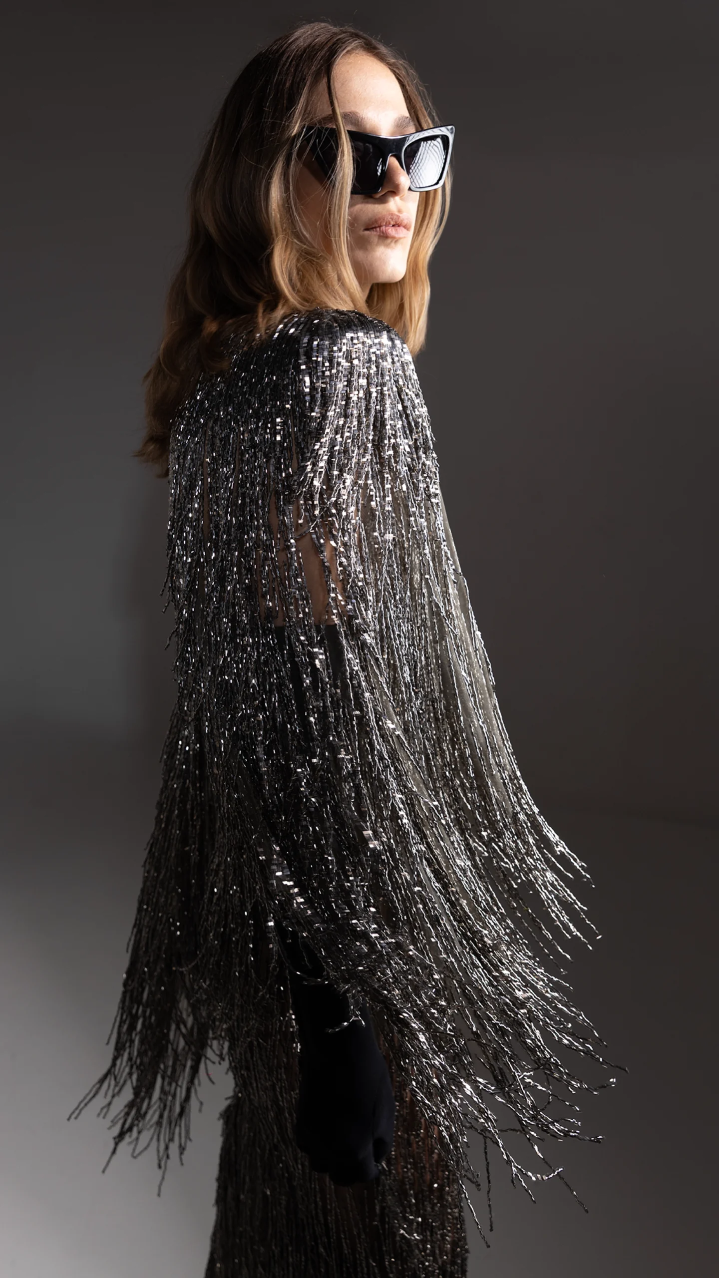 Cropped jacket asimétrica en tono metalgun, realizada íntegramente en tul francés bordado y encastrado artesanalmente en flecos de cristales checoslovacos.